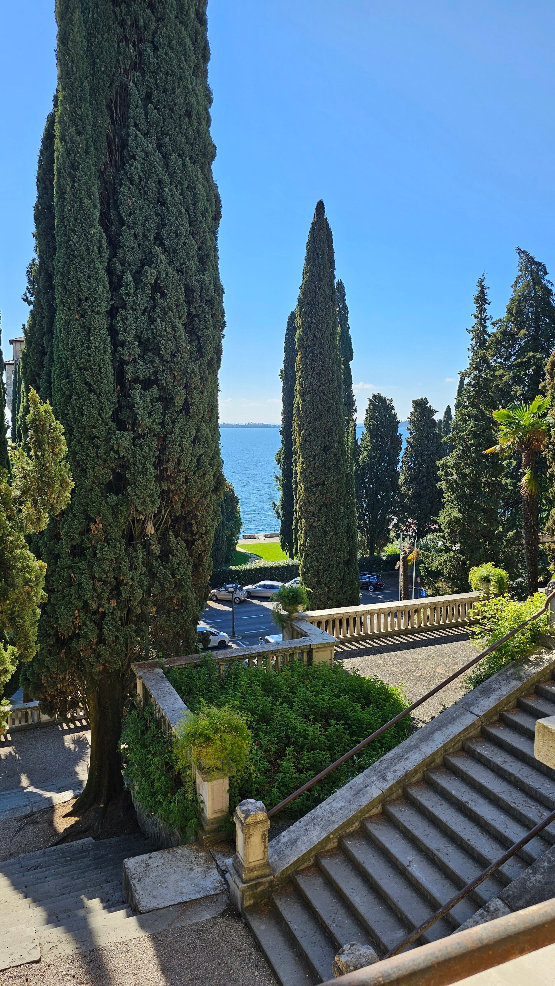 Ehrfürchtig ging ich die Stufen nach oben und stand auf einem kleinen, kiesbedecktem Vorplatz. Rechts befand sich eine Terrasse, deren steinerne Begrenzung ich von unten sehen konnte. Hier sah man zwischen den Zypressen den Gardasee, dessen Wasser in der Sonne glitzerte.